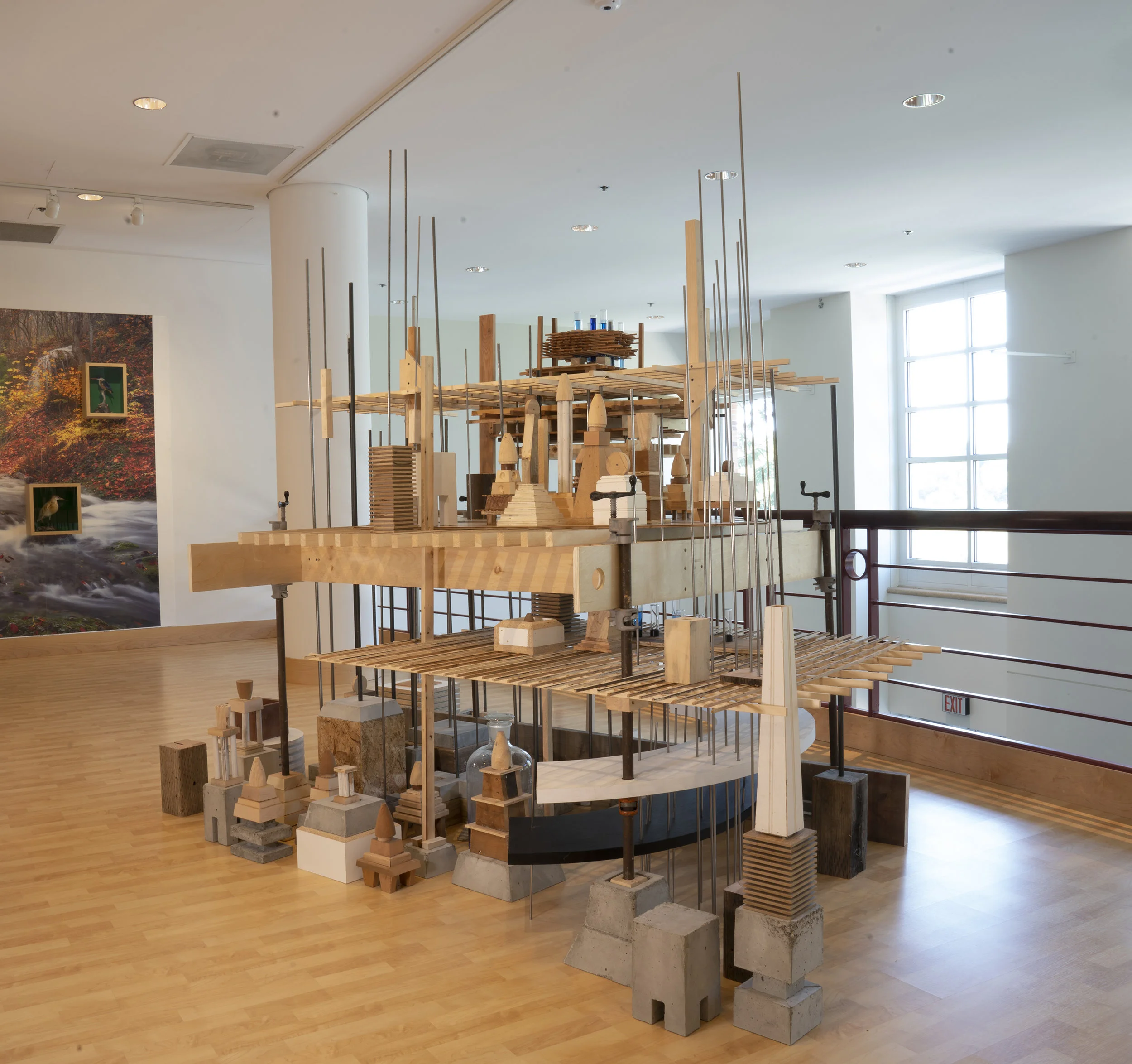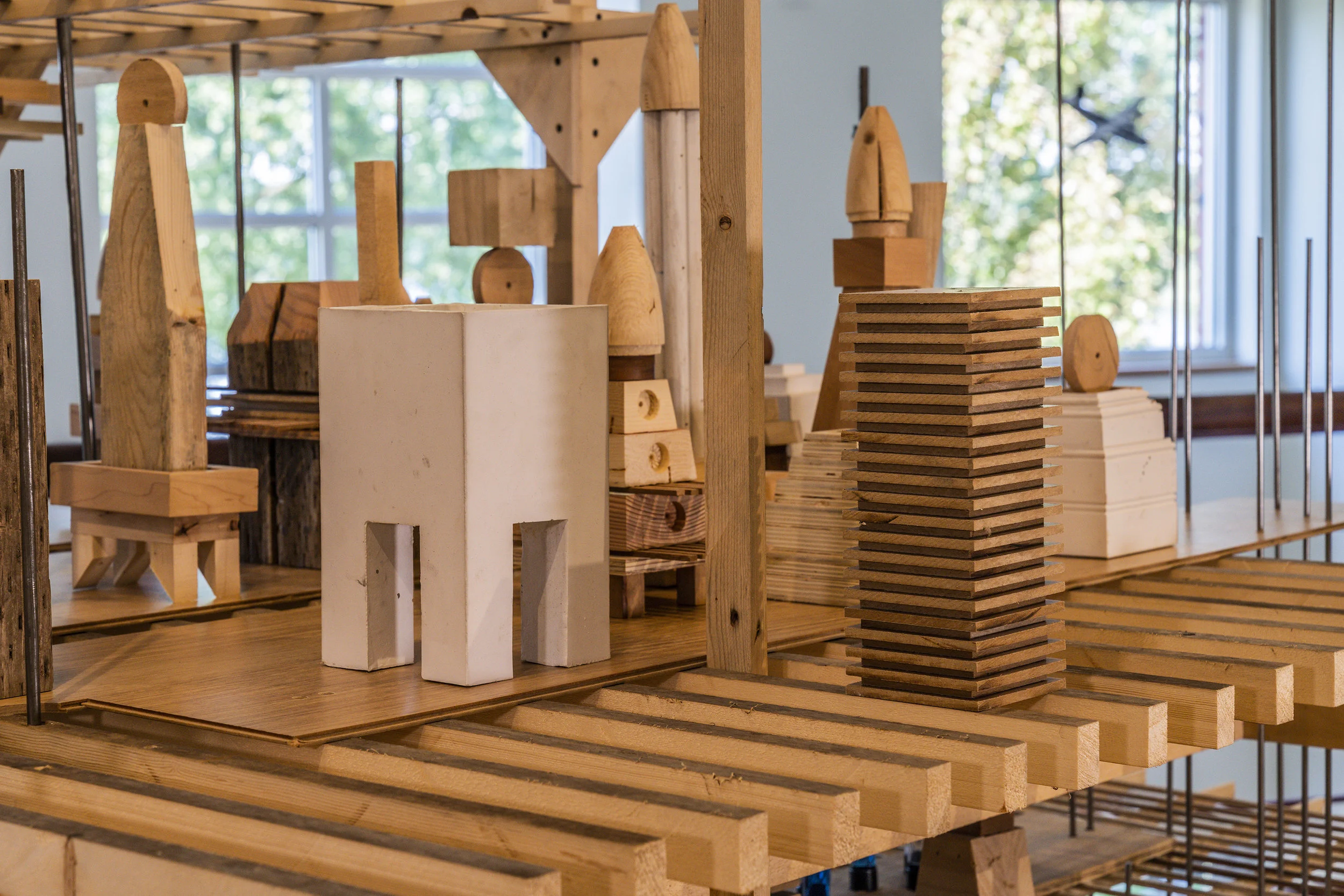 All In A Day’s Work. Boards, plywood, paneling, laminated flooring, concrete, plaster, steel, paint, glass, water, and dye. 7’6” x 10’ 2” x 6’ 6”. 2018.